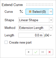 Method Do this Extension Length Enter the Length of the extension itself. Increment Factor Enter an increment Factor, which increases the length by a percentage. For example, if you enter a value of 0.1, the length increases by 10%. Total Length Enter the total Length of the curve. Up to Curve/Surface - Next to Ex. Up to, click the Select button.