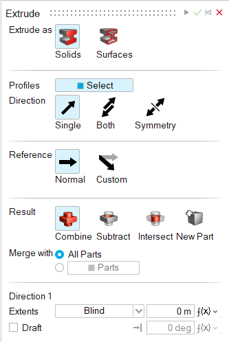 • Merge (only available for Solids): Merge the extruded shape with the existing parts.