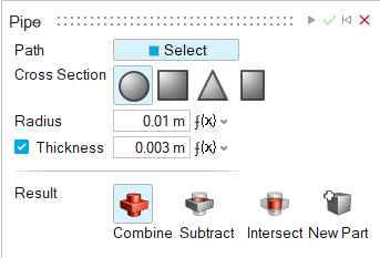 Option Adjust the Cross Section Circular (default) In the guide panel, enter the Radius. Square In the guide panel, enter the Length. Triangular In the guide panel, enter the Length. Rectangular In the guide panel, enter the Length and Width. By default, a solid pipe is created.