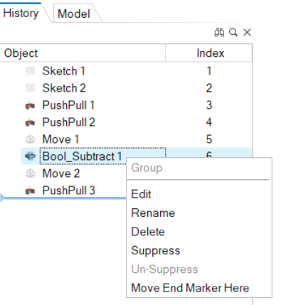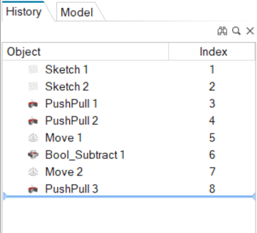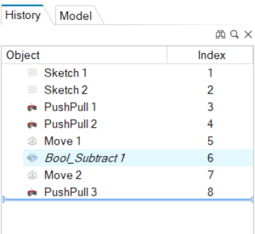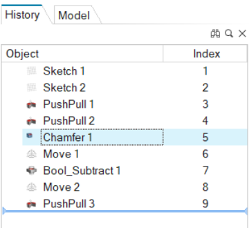 In the History Browser, the editable entities are called construction features (CFs).