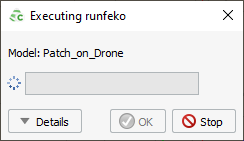The Feko Solver is launched and the Executing runfeko dialog is displayed. The dialog gives step-by-step feedback as the simulation progresses.