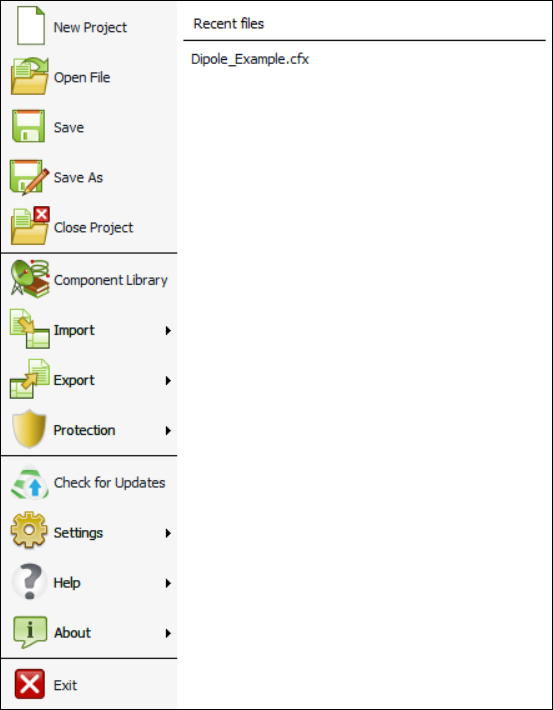 The application menu is similar to a standard file menu of an application. It allows saving and loading of models, print functionality and gives access to application-wide settings.