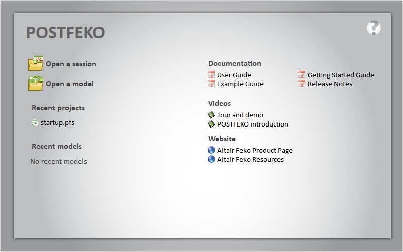 The Feko start page is displayed when starting a new instance (no models are loaded) of CADFEKO, EDITFEKO or POSTFEKO.