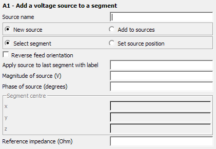 - When this item is selected, the Apply source to last segment with label field becomes active. The label of the segment to which the source must be applied is specified with this text box. If more than one segment has this label, the source is applied to the last segment with this label. Alternatively, one may select Set source position then the feed segment is determined by specifying the Cartesian coordinates in the Segment centre group. These values are in m and are scaled by the SF card if the SF card has Modify all dimension related values checked.