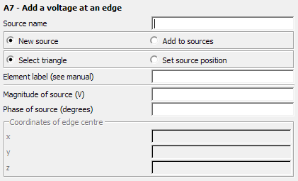 - If this item is selected, a triangle with label specified in the Element label (see manual) text box is searched for. The excitation is placed on the edge positioned opposite the first corner of the triangle. The label must be unique (if possible only one triangle must have this label). If there is more than one triangle with this label then only a single triangle will be fed. Alternatively, when selecting the option, Set source position, the feeding edge is determined by specifying its Cartesian coordinates in the Coordinates of edge centre group. These coordinates are in meters and optionally scaled by the SF card. The edge must be positioned between two triangles or between a triangle and a ground plane or UTD plate.