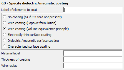Figure 1. The CO - Specify dielectric/magnetic coating dialog, set to Wire coating (Volume equivalence principle).