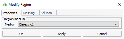 Figure 1. The Modify Region dialog (Properties tab). - In the Medium drop-down list, select the dielectric that you want to apply to the region.