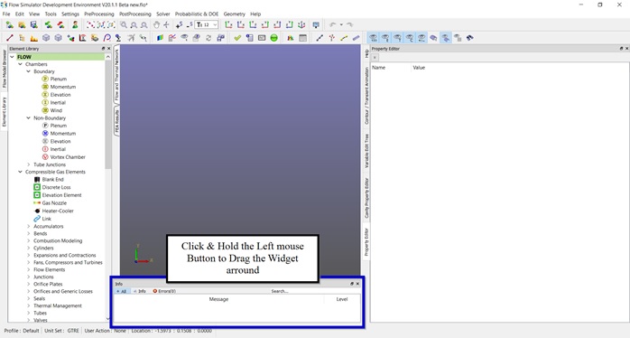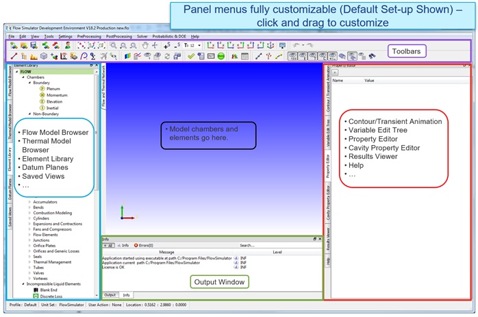 Flow Simulator allows the user to modify how the GUI looks. All menus contained under the Left or Right Panes, and Panes themselves can be moved or turned on/off. There are several options to this end:
