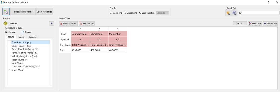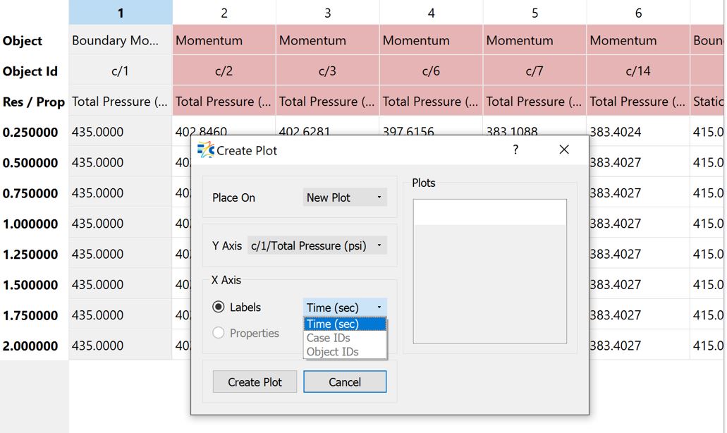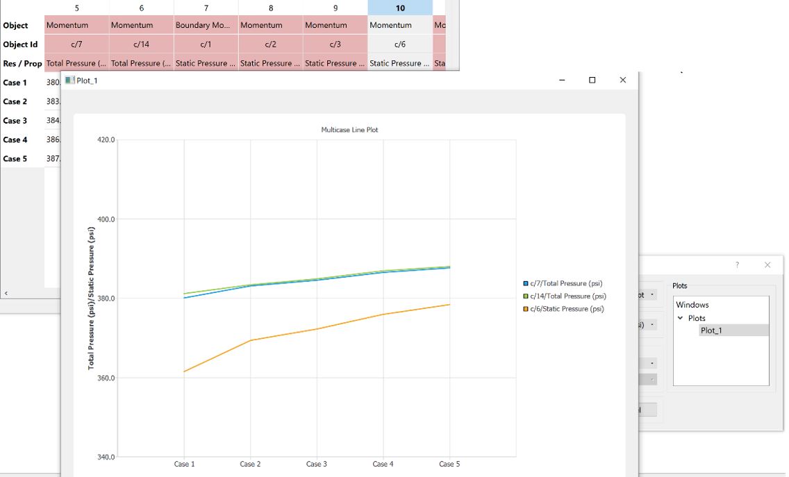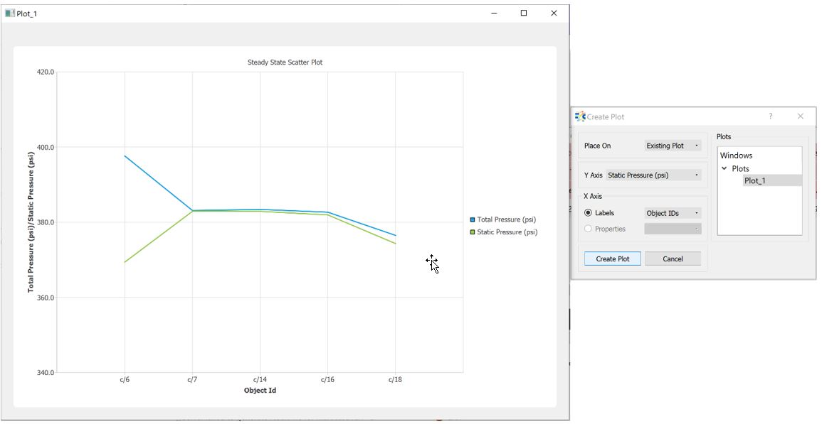 In the below example, first Total Pressure selected and plotted on a New Plot. The plot name Plot_1 is listed in the Plots window. Then, Plot_1 has selected, and Static Pressure plotted on Existing Plot_1.