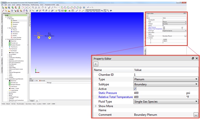 The property editor Allows the user to modify the input to all types of Flow Simulator entities: Elements, chambers, resistors, nodes and components. By default, the items shown are the most important and maybe all that you need to change. Pay close attention to the blue text. These items must have user inputs. Items under “Show More” and “Advanced Options” contain inputs that are not used as often.