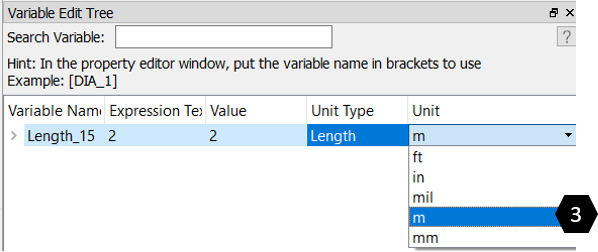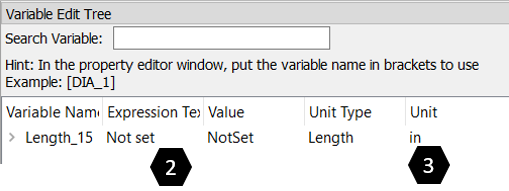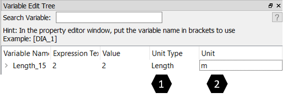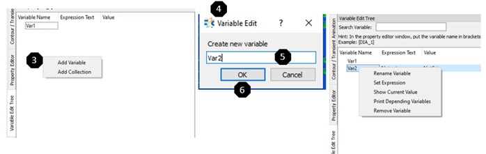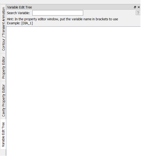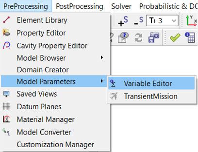 From the menu bar, select PreProcessing > Model Parameter > Variable Editor to access the Variable Edit Tree on the right side of the GUI. The Variable Edit Tree window lists the created variables.