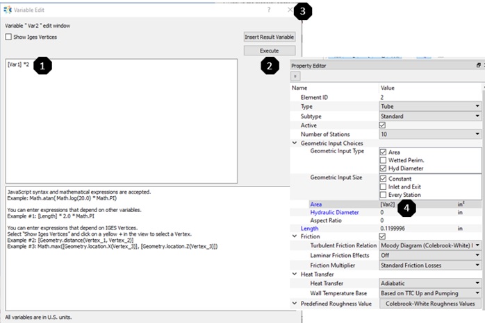 Once a variable is successfully created, it can be used as a value for a specific property (i.e. Area, Length etc) of an element/chamber as shown below.
