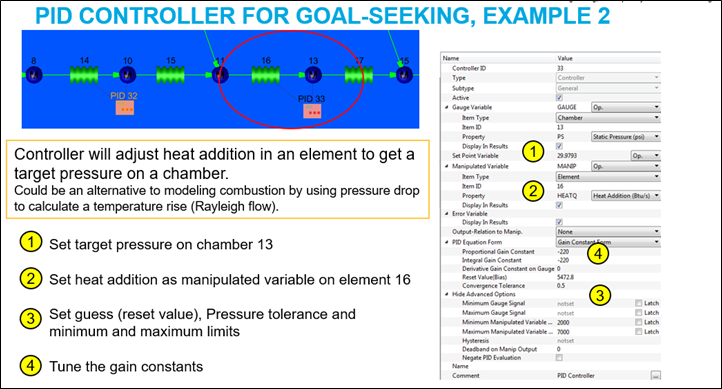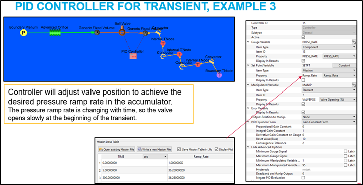 Use the Proportional-Integral-Derivative (PID) Controller to change a model input (the manipulated variable) so that a model result (the gauge variable) matches a user-specified target (a set point). The PID controller can be used for steady state and transient analysis. A PID controller in a steady state analysis behaves like a goal-seek analysis. For instance, use a PID controller to change an orifice diameter to achieve a desired flow rate. A PID controller in a transient analysis can behave like a physical controller device that adjusts a physical component to achieve a specific outcome. For instance, open or close a valve from a cold-water tank to maintain a mixed temperature.