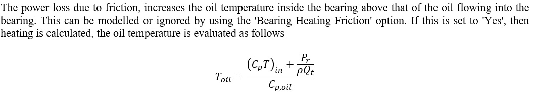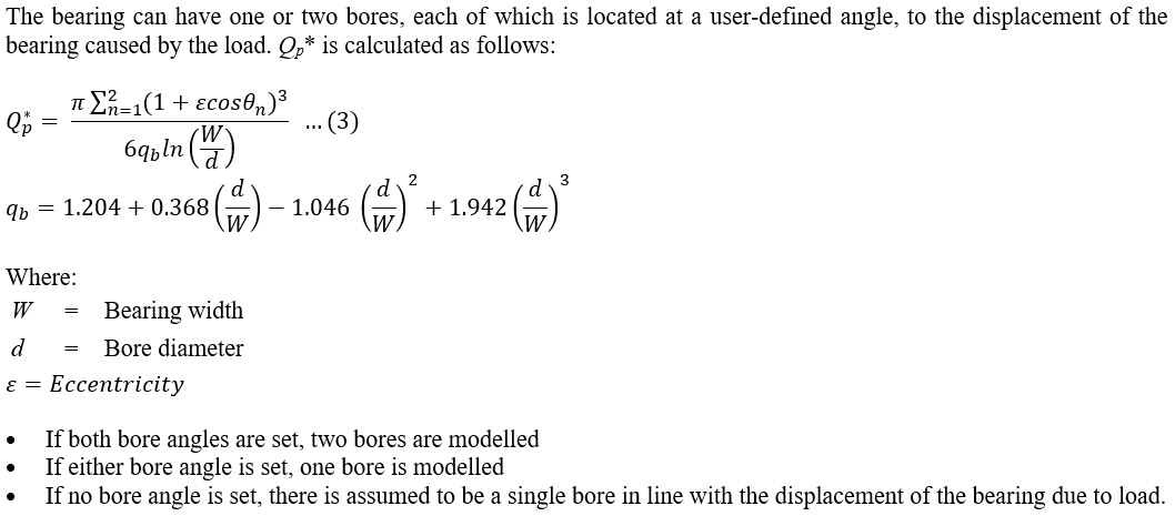 The component simulates a steadily loaded rotating or pivot bearing in a typical engine lubrication system. Its main use is as a discharge element, which simulates lubricant fed to the bearing by a bore or bores, located at various positions relative to the applied loading. The model permits a choice of one or two bores, each of which is located at a user-defined angle to the displacement of the bearing caused by the load.