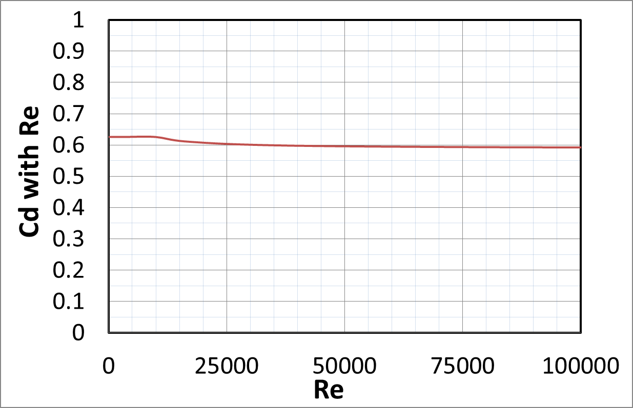 The calculation of the Cd is based on the method summarized in the paper by Idris et al. (ref 1.). The method steps though several characteristics of the orifice and the flow to calculate the final Cd. The details of each step are shown below.