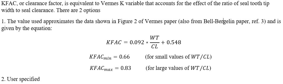 21 | Clearance Factor (KFAC) | Clearance factor is the Discharge Coefficient of a single annular orifice or tooth gap. The value is between 0 and 1, usually between 0.6 and 0.9. See Vermes 1961 or Bell-Bergelin. | |||||||||||||||||||||||||||||||||||||||||||||||||||||||||||||||||||||||||||||||||||||||||||||||||||||||||||||||||||||||||||||||||||||||||||||||||||||||||
