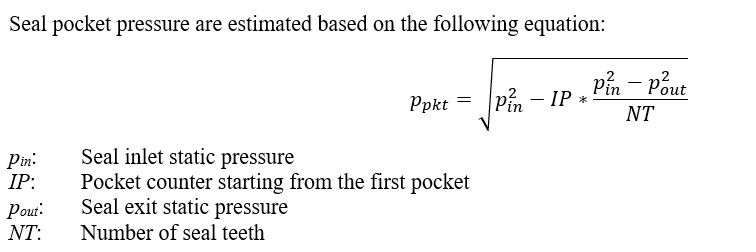 For compressible gasses, the calculated seal mass flow is compared to the mass flow for choked flow through the last tooth. If the choked flow through the last tooth is less than the calculated seal mass flow, the choked flow is used. The equations for the choked flow calculation are: