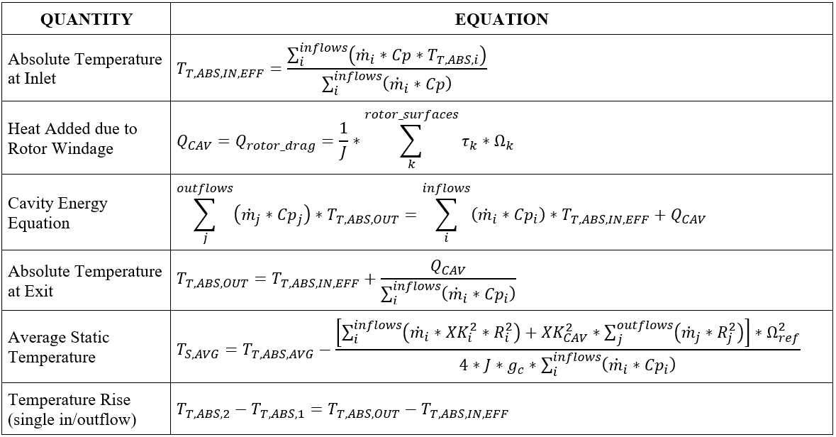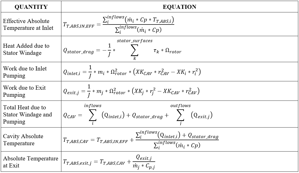 The temperature rise across the cavity is calculated using energy balance accounting for the windage generated by rotor. The Energy balance and Delta Temperature Rise calculation are as follows: