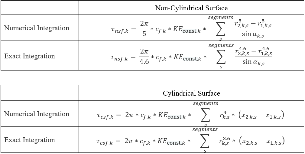 Torque due to non-cylindrical surfaces (Conical, Vertical surfaces with respect to engine centreline) and Cylindrical surfaces (Horizontal surfaces with respect to engine centreline) is computed either by a numerical integral or by the exact integral method. The torque integration method option is available under SolveràAnalysis SetupàSolver ConvergenceàCavity Solver Tolerancesà Torque integration method dropdown menu. The torque coefficients equations are summarized under following table: