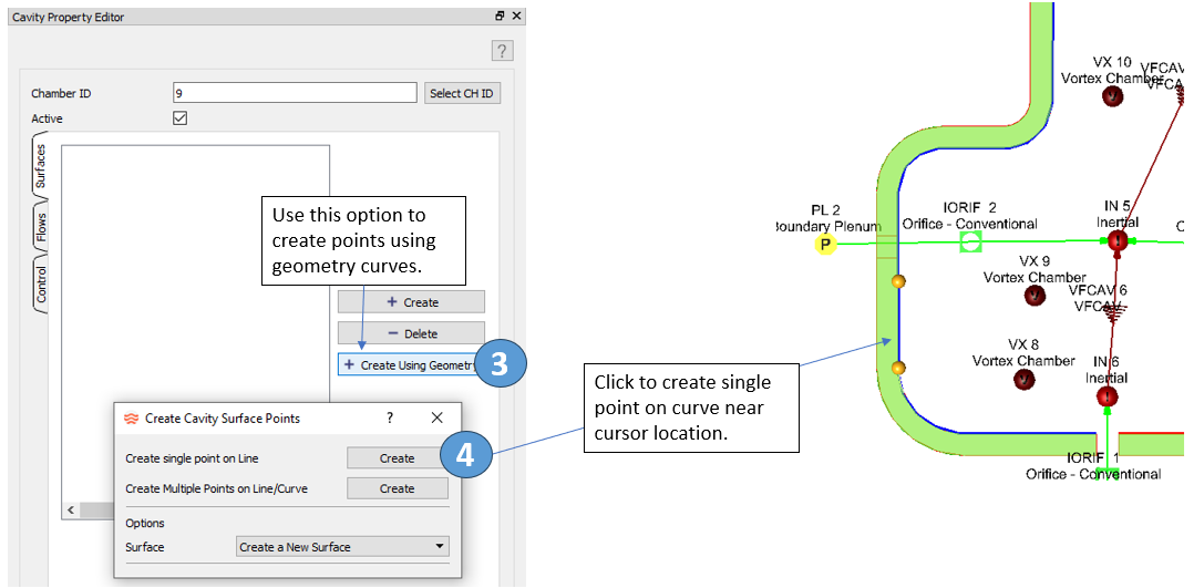 Figure 1. - Create the surfaces of the cavity. Cavities usually have multiple surfaces, with each surface associated with a different part in the machine. Each surface must have a unique speed so do not use points from a rotating and stationary part on the same cavity surface. Cavity surface points can be created using 1)the traditional approach of selecting a point on the screen close to the CAD geometry or 2) using the CAD geometry to place points directly on the curves.