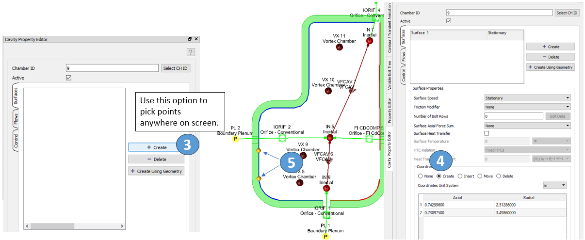 - Swirl Source: The chamber containing the swirl of the flow entering the cavity. Enter a “0” if the swirl of the fluid exiting the Flow Element is to be used (needed if no chamber contains the proper swirl). The Swirl Source for Outflows will only be used by the solver if the flow reverses in the element.