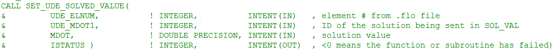 SET_UDE_SOLVED_VALUE Subroutine returns the results to the main solver. Valid SOL_ID: UDE_MDOT1, UDE_TT_EXIT, UDE_VEL_EXIT, UDE_D_MDOT1_D_PTS, UDE_D_MDOT1_D_PSEB UDE_MDOT1 is the only required solution, the others are optional.