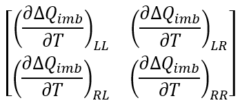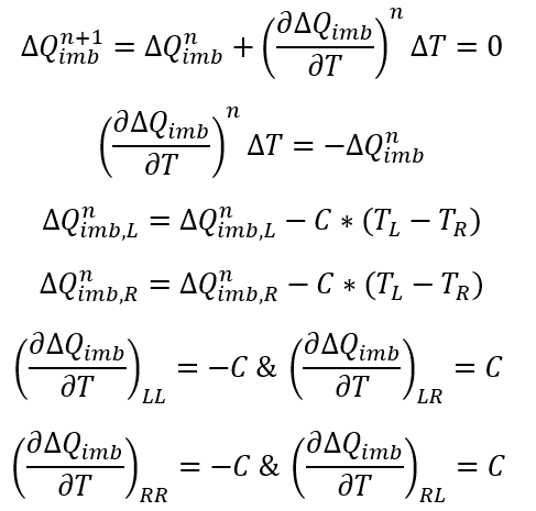 The Jacobian matrix used in Newton’s method is formed by looping over all heat resistors and the residual vector is obtained for free. It’s assumed that heat is flowing from Left node to Right node. The Jacobian matrix for each type of resistor has the form: