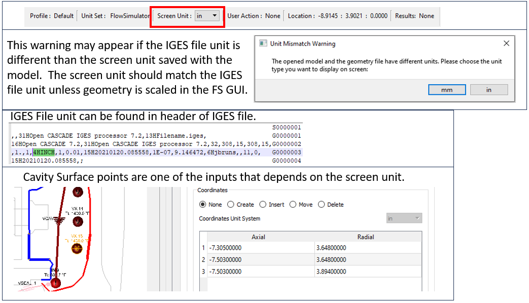 - A Screen Unit (inch, mm, m, and so on) is now used to control model inputs that depend on item locations on the screen. These items include cavity surface points, elevation chamber height, and conductor resistor inputs. Most model items do not depend on the screen location, and the Screen Unit has no effect on these items. The Screen Unit MUST always match the units of the geometry file (IGES or STEP), including any geometry scale factor applied in the Flow Simulator GUI. For instance, if the geometry file is in millimeters and is scaled by a factor of 1/25.4 to make it inches, then the Screen Unit must be inches. The GUI automatically changes the Screen Unit to match the geometry file unit.