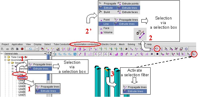 To activate the Extrude lines command, which requires data selection , choose one of the methods presented in the figure below:
