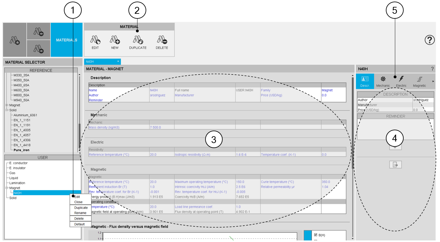 In this area the properties of the material can be edited if it belongs to the USER database.