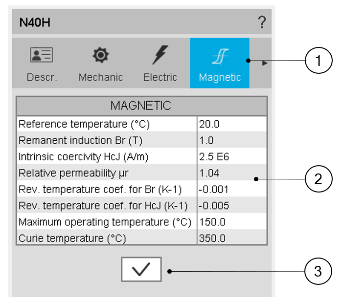 Use the icons of this menu to select the category. Depending on the material family some of all these categories may be