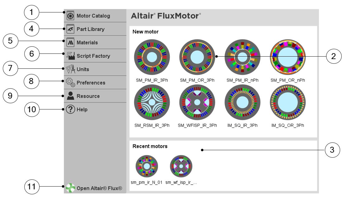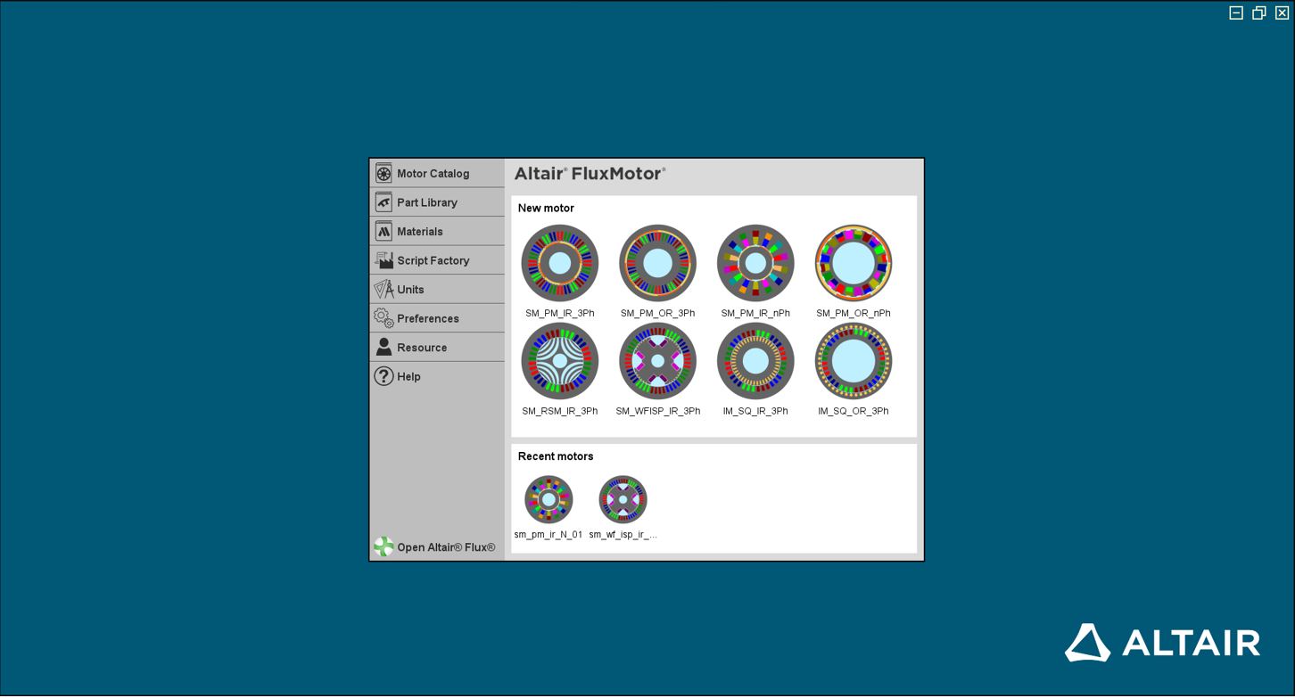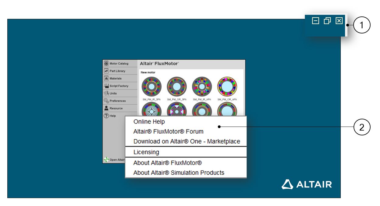 This gives access to Online help, Licensing system and information about FluxMotor® and Altair Simulation Products