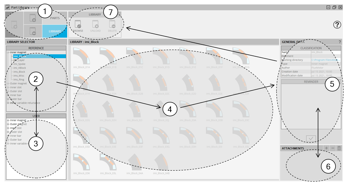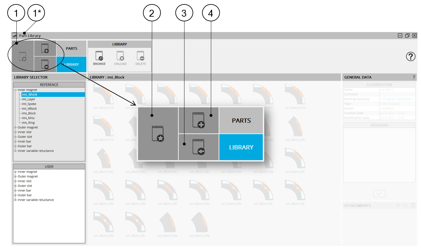 Here are the main zones that compose “LIBRARY” environment of the Part Library.