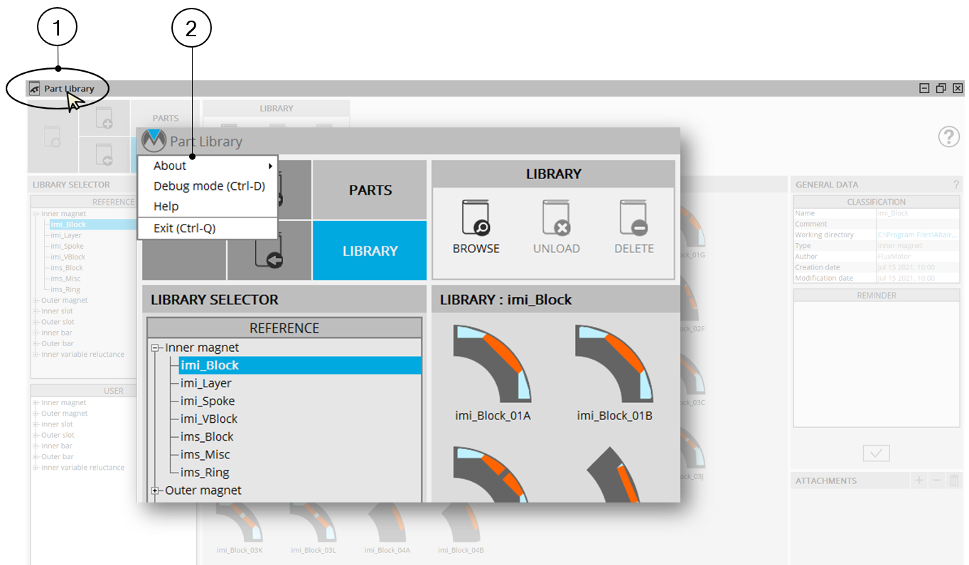 2 List of actions available:ü Aboutü Debug modeü Help to open the online help documentation directly on the chapter dealing with Part Libraryü Exit for closing “Part Library” from the top menu of Part Library
