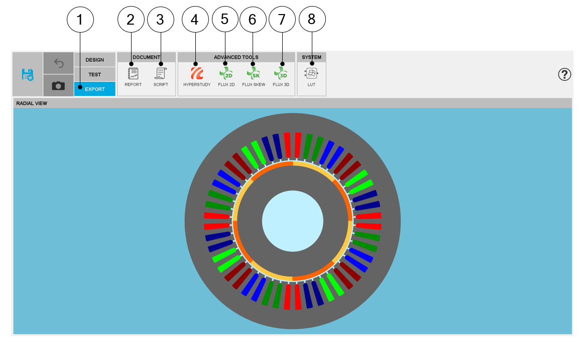 On the other hand, the functions “FLUX2D”, Flux SKEW, FLUX3D allow to build and export a model in Altair® Flux® environment (2D, Skew or 3D) for performing advanced studies either with magneto static or transient applications.