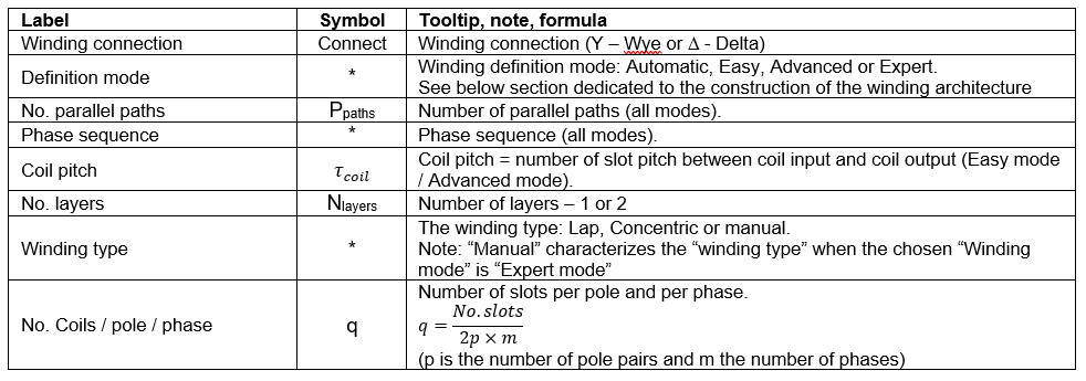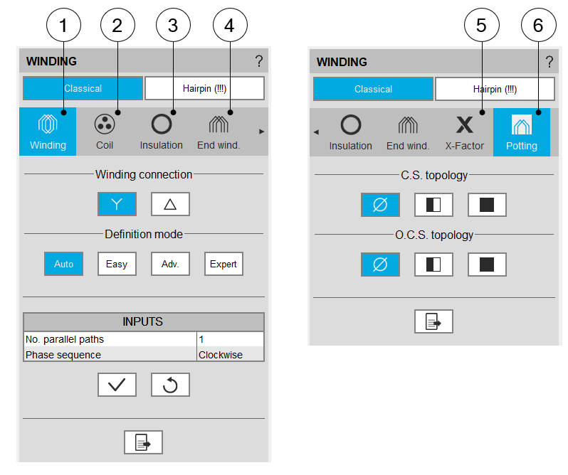 Each of these sections gives access to a dedicated environment to define the winding parameters. For more information, please refer to the next sections.