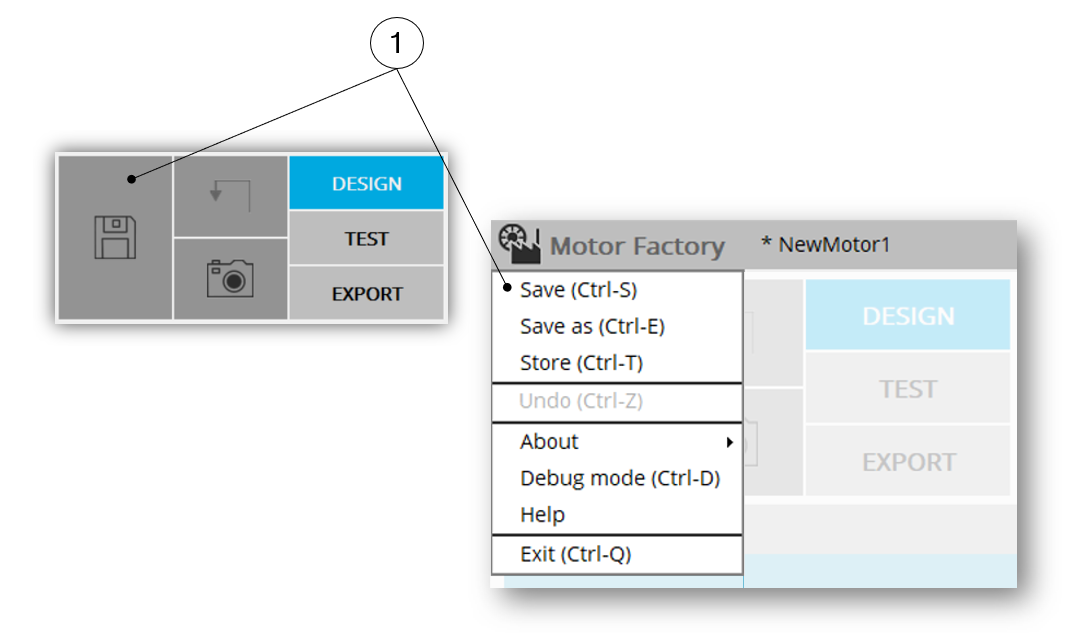 1 Access to the top menu of Motor Factory to access the “SAVE AS” function.