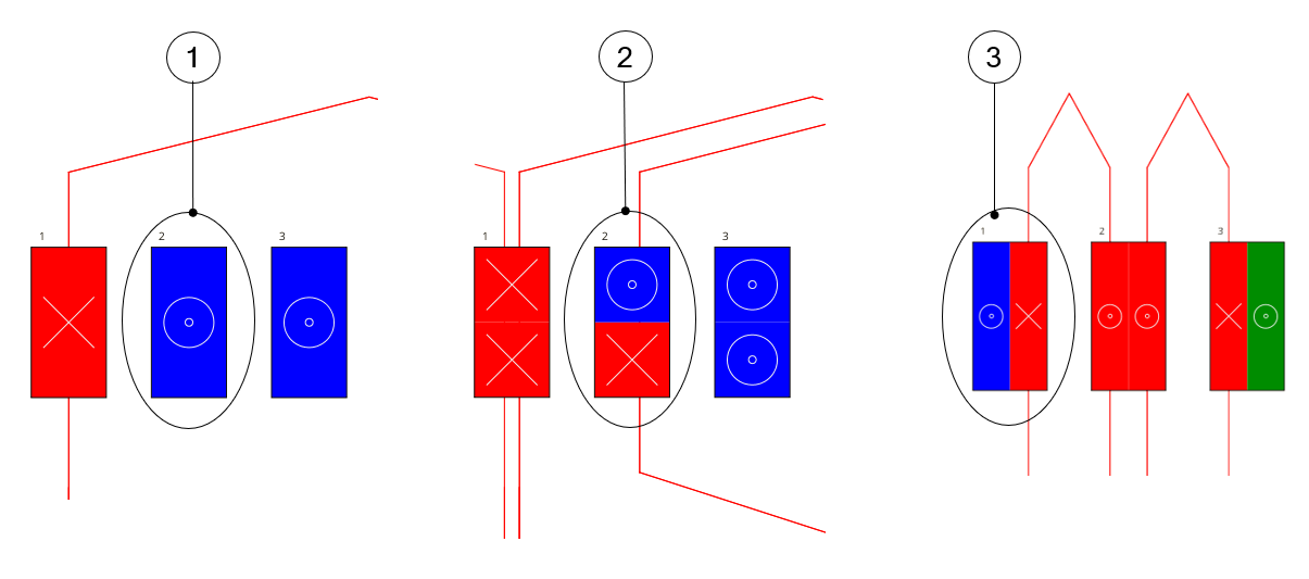 Number of circuits to be duplicated represent the number of elementary circuits to be defined inside each sector to be duplicated. In this example 2 circuits are defined in the represented sector. This is why, there are 2 connection tables to be filled in. One for each circuit: Phase 1 – Circuit 1 and Phase 1 – Circuit 2 |