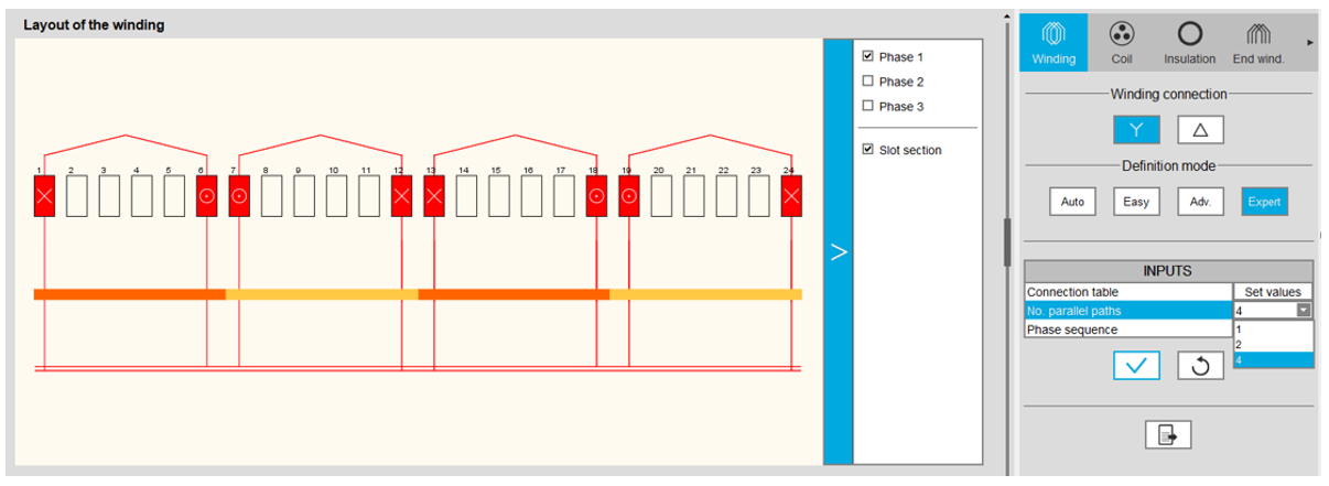 Selection of the number of layers. The solutions depend on the number of slots and the number of poles and the number of phases. Example: With 12 slots and 10 poles and 3 phases, only one solution is proposed: 1 layer. The three possible cases are illustrated in the Easy mode section. |
