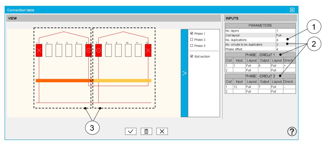 Definition of the number of duplications. This number is computed and proposed to the user. It depends on the number of slots and the number of poles. When the winding architecture to build is cut into several identical parts, the corresponding possible number of duplications are proposed (a short list). By selecting the number of duplications, the user must define only 1/n of the connection table. |