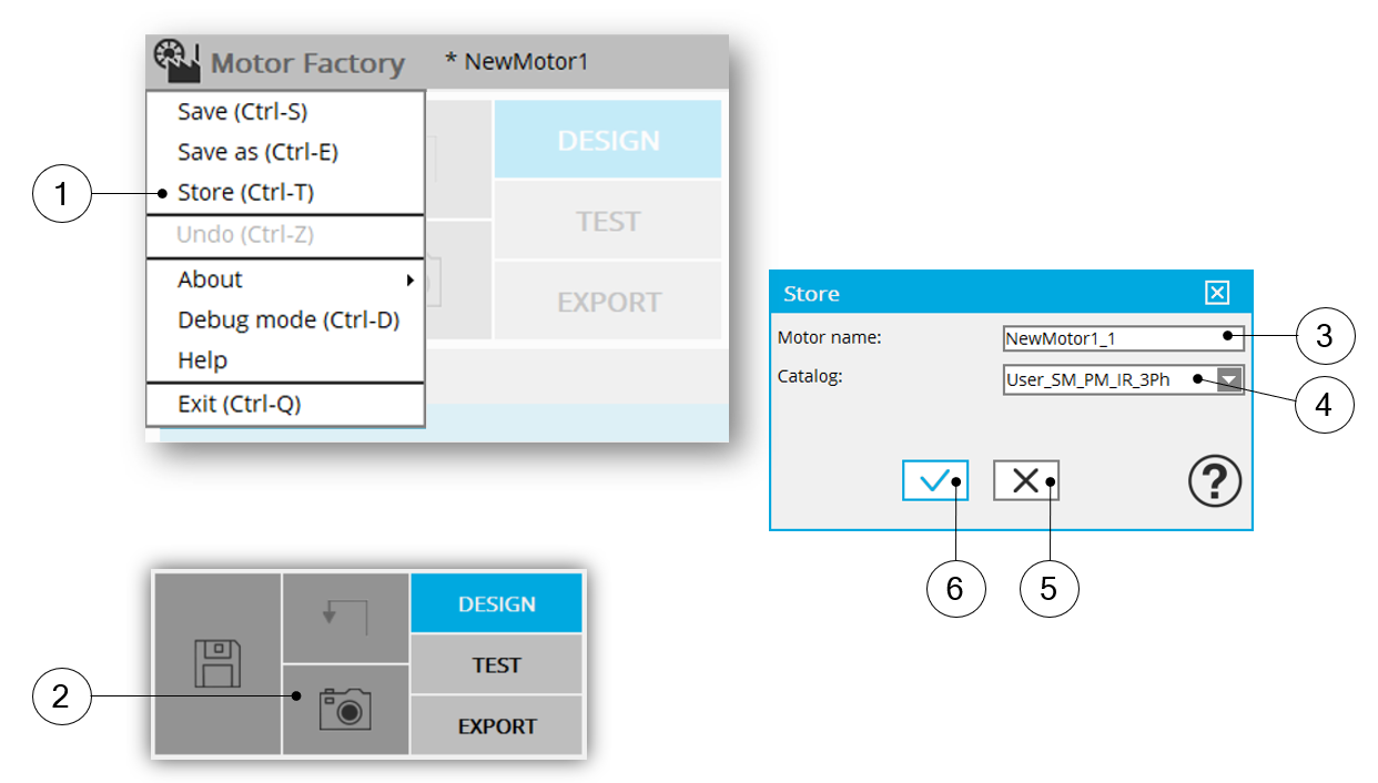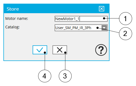 In any case, user has to give a new name of the motor and select an existing catalog in which the motor will be stored.