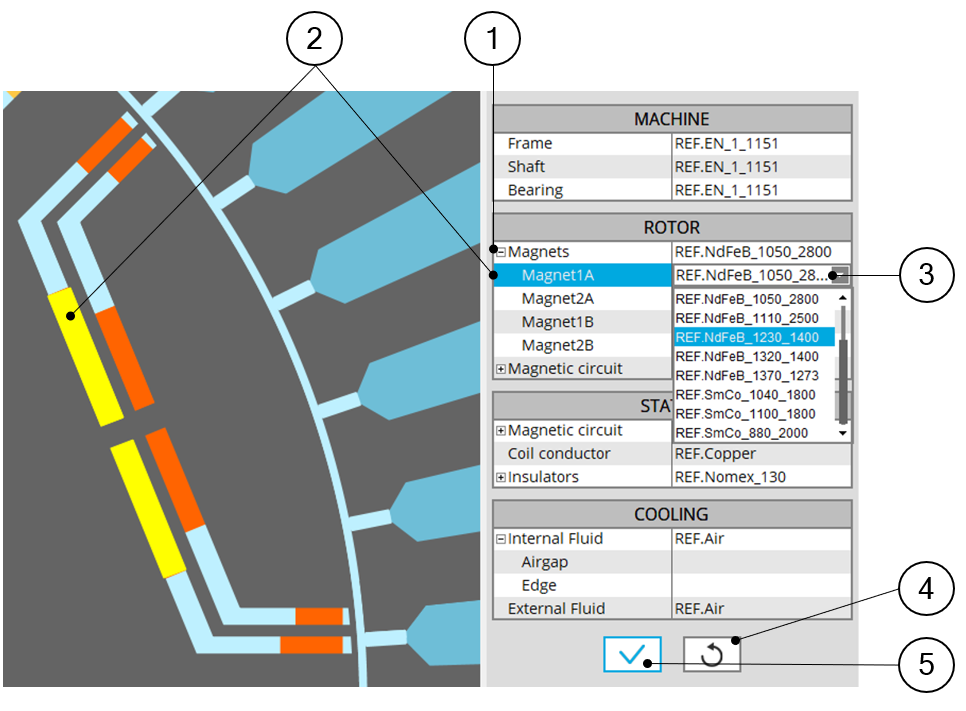 3 | Expand the material list to choose a magnet material for assigning to the selected magnet. |
