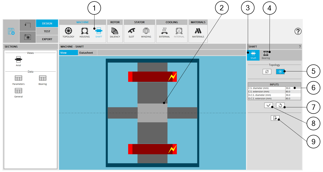 1 | Selection of the MACHINE subset: SHAFT panel (Click on the icon SHAFT) |