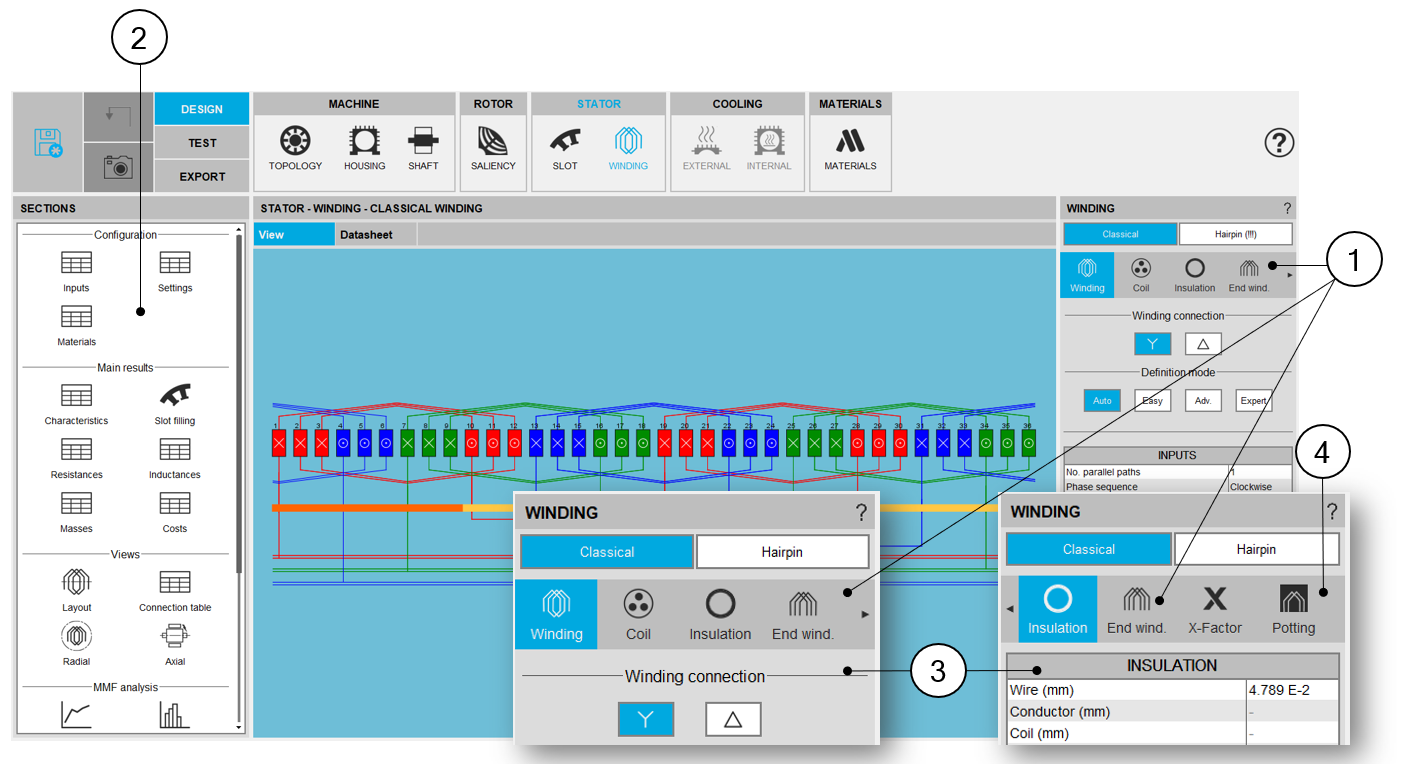 Scrolling selection bar where Winding architecture, Coil, Insulation, End-winding, X-Factor and Potting sections can be selected