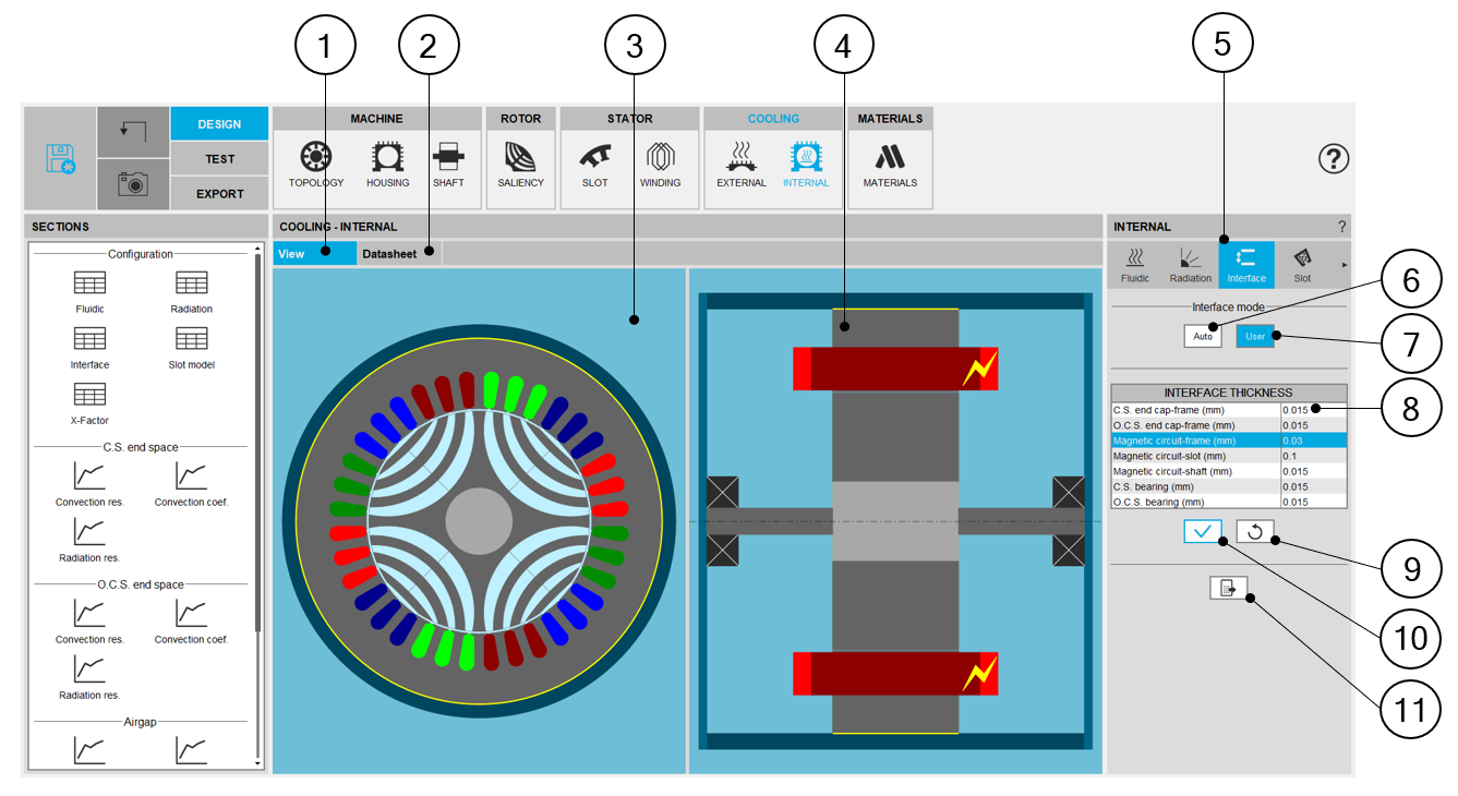 • The bearings: An interface gap thickness is used to compute the thermal resistance of each bearing. These values of contact thickness are used in computations for both bearings (Connection Side and Opposite Connection Side).