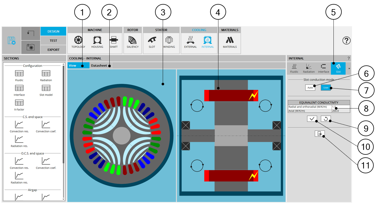 The thermal exchanges from the conductors to the stator core are complex phenomena for which a dedicated model is embedded.