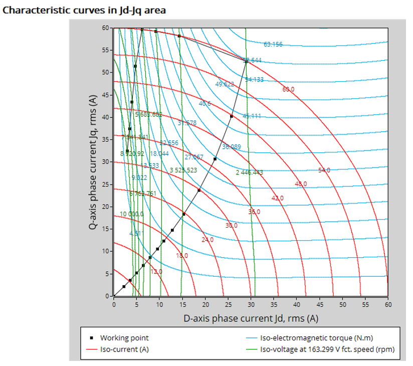 - Characteristic curves in Jd-Jq area - Evolution of the working points in Jd-Jq plane, with iso-torque, iso-current and iso-voltage.
