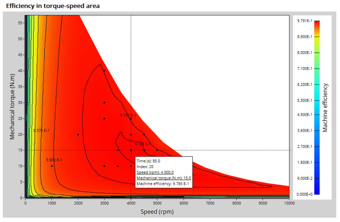 The second feature allows the user to define a duty cycle by giving a list of working points (speed, torque) versus the time. The displayed results illustrate the machine performance over the considered duty cycle (mean, min, and max values).