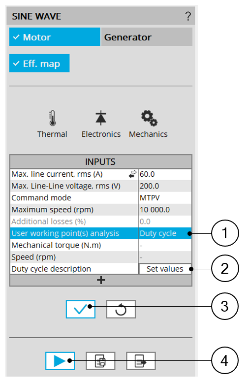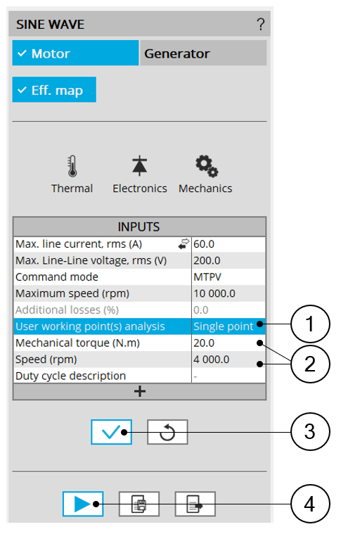 User working point analysis = Single point 1 Select the “Single point” option to perform a computation on one working point. 2 Define the targeted working point mechanical torque and speed. 3 Button to validate and consider the user inputs 4 Button to run the computation -