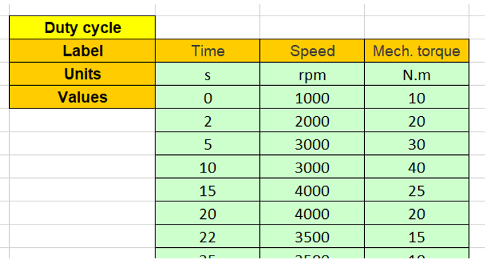 Two ways are possible to fill in the table: either filling in the table line by line or by importing an excel file which all the working points of the duty cycle are defined.
